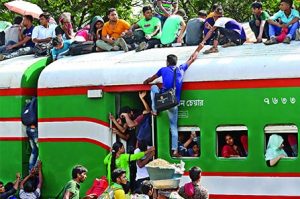 কোন কোন ট্রেন ১২ থেকে ১৬ ঘণ্টা দেরি করে ছেড়েছে। দুর্ভোগের চিত্র দেখা গেছে ফেরী ঘাটেও। সড়ক পরিবহণ ও সেতুমন্ত্রী ওবায়দুল কাদের গতকাল সাংবাদিকদের জানিয়েছেন, সড়ক পথে কোন যানজট নেই তবে ধীর গতি আছে। রেল সংশ্লিষ্টরা বলছেন, বঙ্গবন্ধু সেতুতে শুক্রবার ট্রেনের বগি লাইনচ্যুত হওয়ায় ট্রেনের শিডিউল বিপর্যয় হচ্ছে।
