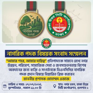 স্টাফ রিপোর্টার : ১৭ জুলাই বৃহস্পতিবার ঢাকা উত্তর সিটি কর্পোরেশন -ডিএনসিসির উদ্যোগে নাগরিক পদক বিষয়ক সংবাদ সম্মেলন ডিএনসিসির নগর ভবনে সকাল ১১ টায় অনুষ্ঠিত হবে। ডিএনসিসির প্রশাসক মোহাম্মদ এজাজ ‘ আমার শহর আমার দায়িত্ব ’ প্রতিপাদ্যকে সামনে রেখে নগর উন্নয়ন, পরিবেশ, সামাজিক সেবা ও জন সচেতনতায় বিশেষ অবদানর জন্য ব্যক্তি ও সংগঠনকে ডিএনসিসির নাগরিক পদক প্রদান বিষয়ক বিস্তারিত ব্রীফ করবেন। ডিএনসিসির উর্ধতন কর্মকর্তারা উক্ত সংবাদ সম্মেলনে উপস্থিত থাকবেন।