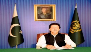 ইমরান খান যখন ভাষণ দেন তখন তার পেছনের দেয়ালে দেশটির জাতির পিতা মোহাম্মদ আলী জিন্নাহর ছবি ঝুলানো ছিল।