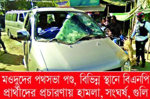 খুলনায় বিএনপির প্রার্থী বকুলের সমর্থকদের ওপর হামলা ও যশোরে ধানের শীষের পোস্টার ছিঁড়ে আগুন দেয়ার ঘটনা ঘটেছে। রাজবাড়ীতে ধানের শীষ প্রার্থীর নির্বাচনী সভা পন্ড- হয়ে যায় ক্ষমতাসীনদের হামলায়। ঝিনাইদহে বিএনপি প্রার্থীর গাড়িবহরে হামলা ভাঙচুরের ঘটনা ঘটেছে। মানিকগঞ্জে বিএনপি প্রার্থীর প্রচারণায় ছাত্রলীগ-যুবলীগের কর্মীরা হামলা চালিয়েছে। ময়মনসিংহের ৩টি আসনে বিএনপির গণসংযোগ-মিছিলে হামলা, অফিস ভাঙচুর হয়। সোমবার রাত ও গতকাল মঙ্গলবার এসব ঘটনা ঘটে।