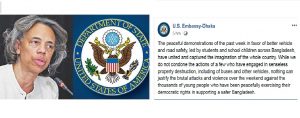 রোববার ফেসবুকে মার্কিন দূতাবাসের অফিসিয়াল পেজে বিবৃতি দিয়ে বলা হয়, নিরাপদ সড়কের দাবিতে দেশব্যাপী চলমান ছাত্র আন্দোলনে সহিংস হামলা কোনোভাবেই সমর্থন করা যায় না।