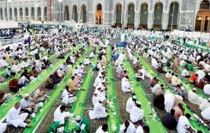 আন্তর্জাতিক ডেক্স : প্রতি বছর রমজান মাসে পবিত্র মসজিদুল হারাম ও মদিনার মসজিদে নববীতে অপূর্ব আধ্যাত্মিক আবহের সৃষ্টি হয়। সউদী সরকারের কঠোর নিরাপত্তার মধ্য দিয়ে মক্কার মসজিদুল হারামে প্রতিদিন বিশ্বের সবচেয়ে বড় ইফতারের আয়োজন করে দেশটির সরকার। মসজিদুল হারামে ইফতার করার জন্য দূর-দূরান্ত থেকে আসরের নামাজের পর থেকে মুসল্লিরা উপস্থিত হন। সউদী আরবেও সময়ের সঙ্গে পাল্টে গেছে খাদ্যাভ্যাস, সেই সঙ্গে ইফতারও। এখন মসজিদুল হারামে প্রতিদিন ইফতারে সওম পালনকারীদের জন্য দেওয়া হয় বিভিন্ন ধরনের মসলাদার খাবার; স্যুপ বা শরবত, কাবাব, ফাতির (রুটি), লবণ, সবজি, খেজুর ও জমজমের পানি।