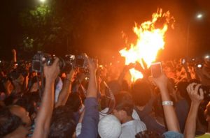একুশে বার্তা প্রতিবেদন : কোটা সংস্কারের দাবি আন্দোলনরত শিক্ষার্থীরা কৃষিমন্ত্রী মতিয়া চৌধুরীর কুশপুত্তলিকা দাহ করেছে। আজ মঙ্গলবার রাত ৭টা ৫২ মিনিটে ঢাকা বিশ্ববিদ্যালয়ের রাজু ভাস্কর্যে আন্দোলনরত শিক্ষার্থীরা এই কুশপুত্তলিকা দাহ করে। গত সোমবার সংসদে মতিয়া চৌধুরী আন্দোলনকারীদের ‘রাজাকারের বাচ্চা’ বলে সম্বোধন করেন। আন্দোলনকারীরা তার বক্তব্য প্রত্যাহার ও ক্ষমা চাওয়ার জন্য বিকেল ৫টা পর্যন্ত সময় বেঁধে দেয়। নির্ধারিত সময়ের মধ্যেও মতিয়া চৌধুরী বক্তব্য প্রত্যাহার ও ক্ষমা না চাওয়ায় বিকেল ৫টার পর নতুন করে আন্দোলন শুরু করে শিক্ষার্থীরা। এসময় বিভক্ত আন্দোলনকারীরা আবারও এক সঙ্গে আন্দোলন শুরু করে।
