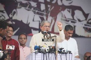 একুশে বার্তা প্রতিবেদন : আগামীকাল সংলাপে দাবি মানা না হলে ৮ নভেম্বর রাজশাহী অভিমুখে রোডমার্চ কর্মসূচি পালন করা হবে বলে জানিয়েছেন বিএনপি মহাসচিব মির্জা ফখরুল ইসলাম আলমগীর। একই সঙ্গে তফসিল না পেছানো হলে নির্বাচন কমিশন অভিমুখে পদযাত্রা কর্মসূচিরও ঘোষণা দিয়েছেন তিনি। আজ মঙ্গলবার সোহরাওয়ার্দী উদ্যানে জাতীয় ঐক্যফ্রন্টের জনসভায় সভাপতির বক্তব্যে মির্জা ফখরুল এ কর্মসূচি ঘোষণা দেন। তিনি বলেন, আগামীকালের সংলাপে নাটক করলে চলবে না। প্রতিদিন গ্রেপ্তার করা হচ্ছে। খালেদা জিয়ার মুক্তি, সংসদ ভেঙ্গে দিয়ে নির্দলীয় সরকারের অধীনে নির্বাচন দিতে হবে। জনসভায় মির্জা ফখরুল বলেন, কারাগারে যাবার আগে আমাদের নেত্রী বলেছিলেন, তিনি কারাগারে যেতে ভয় পান না। গণতন্ত্রকে মুক্ত করার জন্য জাতীয় নেতৃবৃন্দকে নিয়ে জাতীয় ঐক্য গড়ে তুলতে হবে।