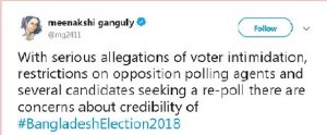 বাংলাদেশে অনুষ্ঠিত জাতীয় সংসদ নির্বাচনের বিশ্বাসযোগ্যতা নিয়ে উদ্বেগ প্রকাশ করেছেন আন্তর্জাতিক মানবাধিকার বিষয়ক সংগঠন হিউম্যান রাইটস ওয়াচের দক্ষিণ এশিয়া বিষয়ক পরিচালক মিনাক্ষী গাঙ্গুলি। এক টুইট বার্তায় এ উদ্বেগের কথা জানিয়েছেন তিনি। এতে তিনি লিখেছেন, ভোটারদের ভীতি প্রদর্শনের ভয়াবহ অভিযোগ, ভোটকেন্দ্রে বিরোধীদের এজেন্ট দেয়ায় বিধিনিষেধ ও বিপুল সংখ্যক প্রার্থীর পুনঃনির্বাচনের দাবি উঠেছে। এসব মিলে বাংলাদেশের জাতীয় সংসদ নির্বাচনের বিশ্বাসযোগ্যতা নিয়ে উদ্বেগ দেখা দিয়েছে।