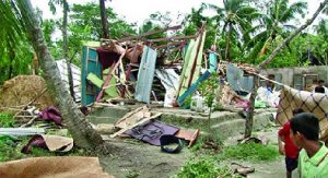 কয়রায় ৪ শতাধিক ঘরবাড়ি বিধ্বস্ত : খুলনার কয়রা উপজেলায় ঘূর্ণিঝড় ফণীর প্রভাবে গত তিনদিনে ৪ শতাধিক কাঁচা ঘরবাড়ি সম্পূর্ণ বিধ্বস্ত হয়েছে। এতে ক্ষতিগ্রস্ত হয়েছে প্রায় ৮ কিলোমিটার বেড়িবাঁধ। গতকাল দুপুরের জোয়ারে ক্ষতিগ্রস্ত বেড়িবাঁধের তিনটি স্থান ছাপিয়ে নদীর পানি লোকালয়ে প্রবেশ করেছে। তবে ক্ষতিগ্রস্ত বাঁধের ওই সব স্থানে স্থানীয় ইউনিয়ন পরিষদের সহযোগিতায় লোকজন মেরামতের চেষ্টা অব্যাহত রেখেছেন। ঘূর্ণিঝড়ের কারণে শুক্রবার যারা স্থানীয় ১১৬টি সাইক্লোন শেল্টারে আশ্রয় নিয়েছিলেন তারা শনিবার দুপুরের পর থেকে বাড়ি ফিরতে শুরু করেছেন। তবে যাদের ঘরবাড়ি ভেঙে গেছে তাদের অনেকেই সাইক্লোন শেল্টারে অবস্থান করছেন। কয়রা উপজেলা প্রকল্প বাস্তবায়ন কর্মকর্তার (পিআইও) কার্যালয় সূত্রে জানা গেছে, ঘূর্ণিঝড় ফণির কারণে গত তিন দিনে (বৃহস্পতি, শুক্র ও শনিবার) উপজেলার সাতটি ইউনিয়নে ৪৩৩টি কাঁচাঘর সম্পূর্ণরূপে বিধ্বস্ত হয়েছে। এ ছাড়া ১ হাজার ৪০০ কাঁচা ঘর আংশিক ক্ষতিগ্রস্ত হয়েছে। এতে কিছু স্থানে বোরো ধানের ক্ষতি হয়েছে বলে জানা গেছে। তবে স্থানীয় চিংড়ি ঘেরের কোনো ক্ষতি হয়নি। ফণীর প্রভাবে স্থানীয় নদীতে পানি বৃদ্ধি হওয়ায় ৮ কিলোমিটার বেড়িবাঁধ ক্ষতিগ্রস্ত হয়েছে।