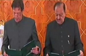 শনিবার ইসলামাদের আইওয়ান আল সদরে ইমরান খানকে শপথ বাক্য পড়ান পাকিস্তানের বর্তমান প্রেসিডেন্ট মামনুন হোসাইন।