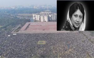 বুধবার ভোর থেকেই ঢাকাসহ দেশের বিভিন্ন জেলা থেকে আসতে থাকে শোকের মিছিল। বেলা বাড়ার সঙ্গে শোকের স্রোত মিলিত হয় রাজধানীর মানিক মিয়া অ্যাভিনিউ ও সংসদ ভবন এলাকায়। দলমত-নির্বিশেষে সর্বস্তরের মানুষ ছুটছিলেন সাবেক প্রধানমন্ত্রীকে শেষ বিদায় জানাতে। জানাজার সময় স্রোত ছাপিয়ে যায় রাজধানীর কারওয়ান বাজার থেকে শ্যামলী পর্যন্ত। যেদিকে চোখ গেছে শুধু শোকার্ত মানুষ। অনেকের চোখের কোনা পানিতে ছলছল করছিল। অনেকে কান্নায় ভেঙে পড়েন।
